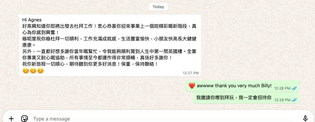 在這行這麼多年,我收穫的不僅僅是業績,更是一班像 Billy 這樣,從客戶變成朋友的知己。我們一起經歷過挑選物業的糾結、成交的喜悅,甚至見證彼此家庭的成長(謝謝 Billy 對我小朋友的祝福!)。要暫別這班這麼好的香港客戶,說真的,心裡有一萬個不捨。