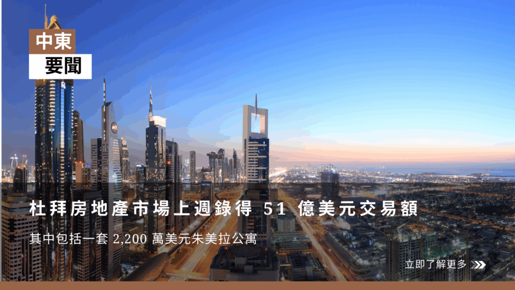 根據杜拜土地局(Land Department)公布的最新數據,杜拜房地產市場於上週錄得高達 185 億迪拉姆(約合 51 億美元)的總交易…